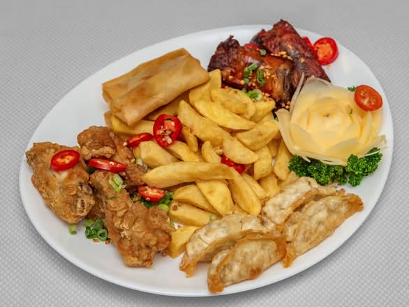 (Salt & Pepper style: spare rib x4, chicken wing x4, chips), chicken gyoza x4 & sauce, Mini veg roll x4