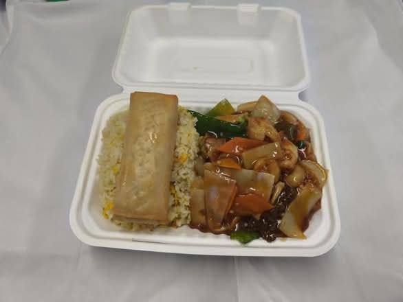 Mixed Meat With Mixed Vegetables, Egg Fried Rice, Spring Roll
